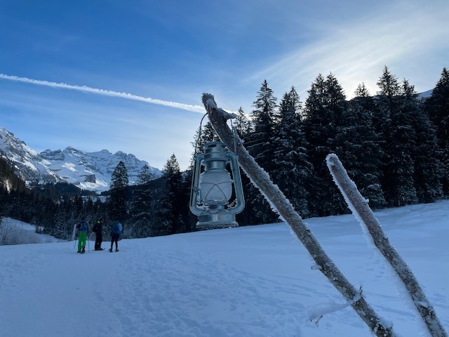 Despite its initial steepness, the first section of the trail passes by quickly due to its diversity: open spaces, idyllic wooden houses, occasionally crossing hedges, forest sections, as well as running and frozen water. Close after the option to already go back to Kiental for a shorter 7-8 km hike (you will take this path on the way back) and a short incline, you will turn right to follow the lantern-path. Depending on the time of year and day, be aware that around this section, the sun will fully be blocked by the surrounding mountains and it might become very cold.